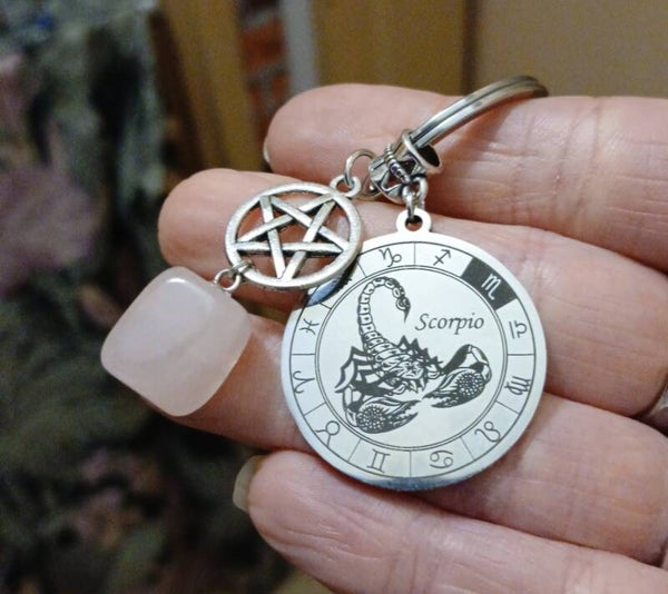 ✨️ Porte-clés Signe Astrologique Scorpion – Quartz Rose & Pentagramme