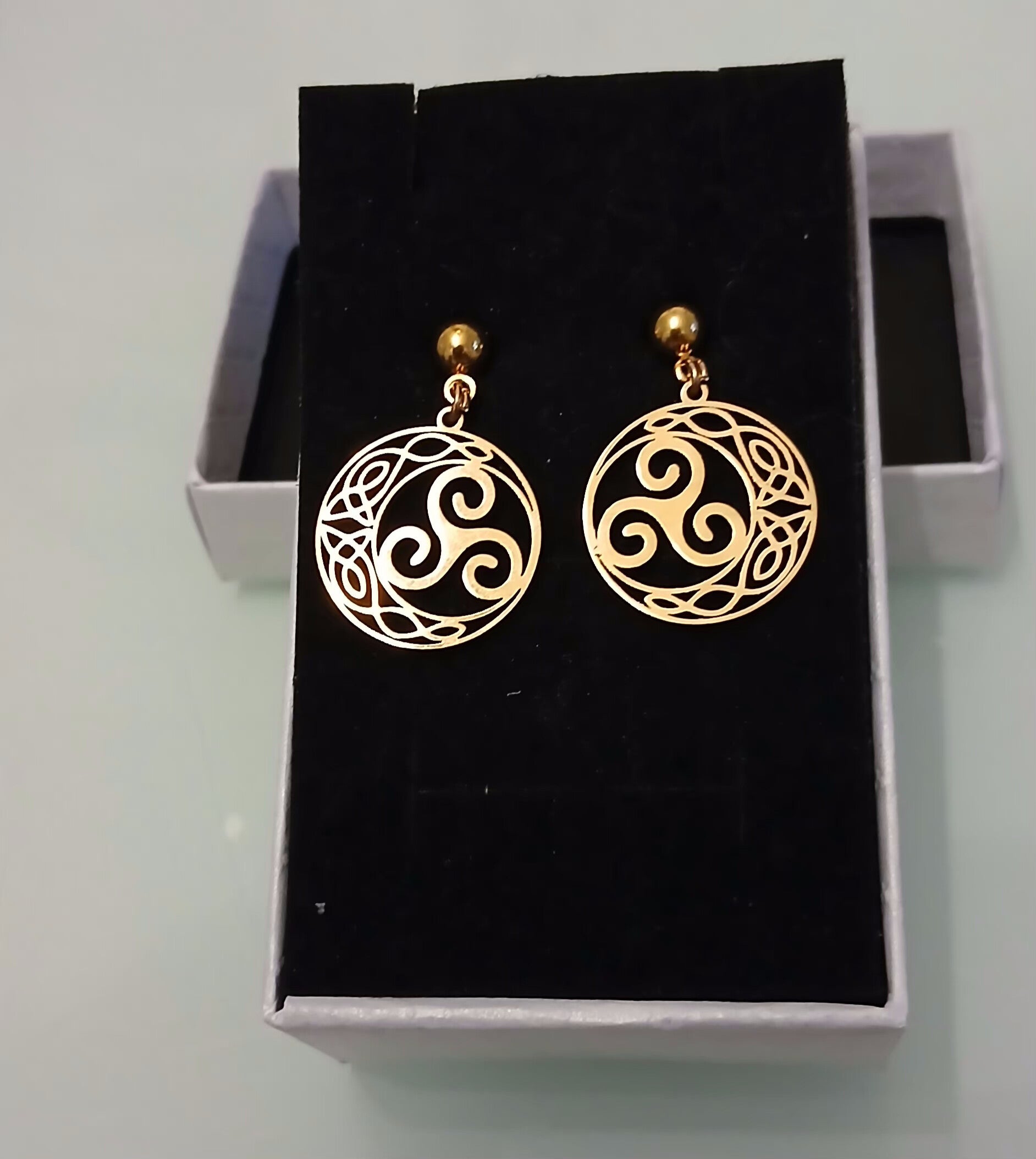 Ces boucles d’oreilles sont réalisées avec soin, mettant en valeur le symbole du Triskel.